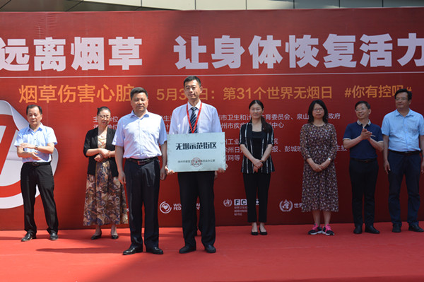 公共场所禁止吸烟已经成为一种共识和社会文明、人类进步的体现。为了倡导更多的公共场所、大型商业街区运营管理者提升行业自律,强化禁烟宣传,树立控烟标杆,5月31日世界无烟日当天我市诞生了第一条“无烟示范街区”——三胞国际广场。市爱卫办主任曹配亮为三胞国际广场授牌。泉山区卫计委主任谢夫玲,市疾控制中心副主任常桂秋共同为三胞国际广场“禁烟劝阻员”代表颁发荣誉臂章。他们分别是来自管理、服务一线的保安和保洁人员,他们也是发现和制止公共场所吸烟的“第一线人”。活动现场主持人也真诚的向全社会发出呼吁:希望大家理解和尊重他们的工作,自觉维护公共环境,绝不在公共场所吸烟!从而远离烟草,选择健康!