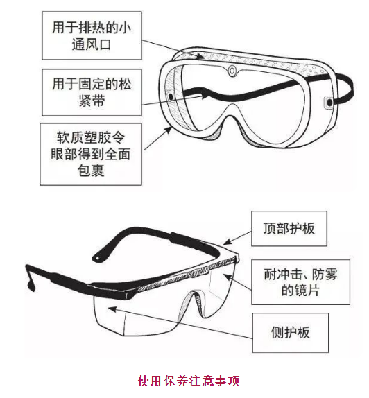 使用时:应双手小心戴或摘眼镜,不要损坏镜片;眼部防护用品应尽量专人专用,如多人共用或有眼疾传染的可能。