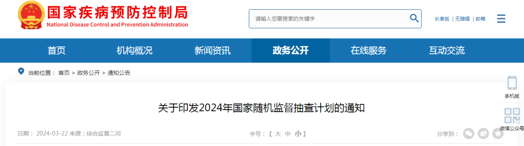 为加强公共卫生、医疗卫生、中医药监督执法工作,按照2024年卫生健康重点工作有关要求,国家疾控局、国家卫生健康委和国家中医药局联合制定了2024年国家随机监督抽查计划(以下简称计划,可从国家疾控局网站下载)。现将有关事宜通知如下:
